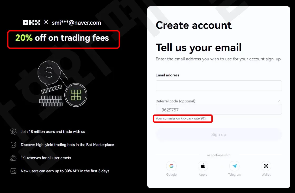또 다른 확인법은 PC로 수수료 할인링크를 접속했을 경우 검은 화면에 20% Off on trading fees 문구가 있는 것을 발견하실 수 있습니다. 해당 문구가 있으면 할인이 적용된 가입링크입니다.